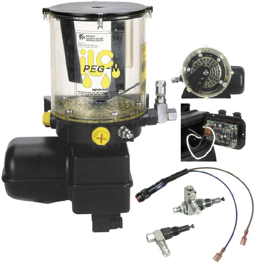 1 eletrobomba PEG 2, de 12 ou 24 V, com elementos bombeadores de graxa com alívio para pressão máxima.